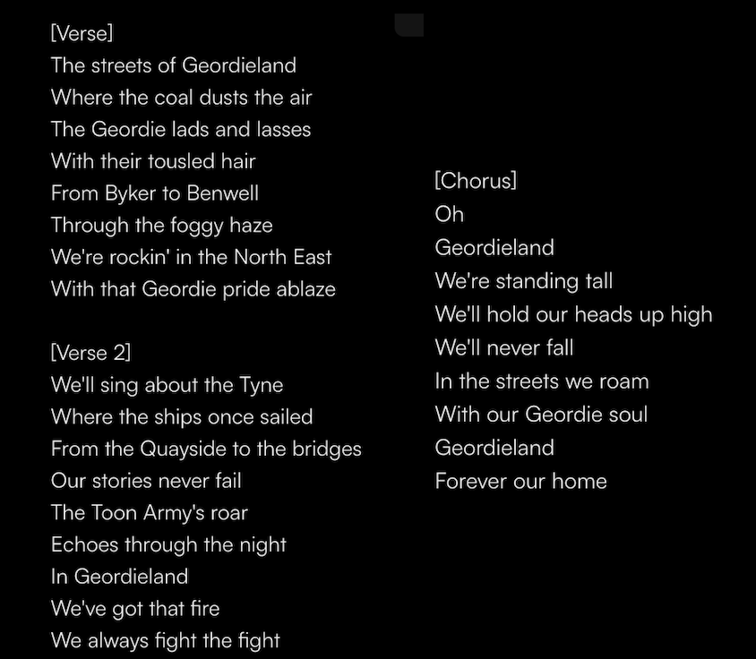 Note the below lyrics. With the use of the word ‘Geordie’ in my prompt to the AI, it feels like the track is heavily built around ‘buzzwords’ in said command. I therefore wonder to what extent the AI on SUNO taps into keywords in the command. Perhaps it is unfamiliar with the notion of 'Geordie' and the things associated with this term due to its American-centricity (SUNO is founded in the US, with workers previously of the American bases of companies Meta, TikTok and Kensho). This taps into ideas of algorithmic inequality (perhaps most famously explained by the project World White Web.). A little more broadly, could potential bias creep into the AI model of Suno due to its American centricity? How might this reflect versions of reality, create narratives and beyond?