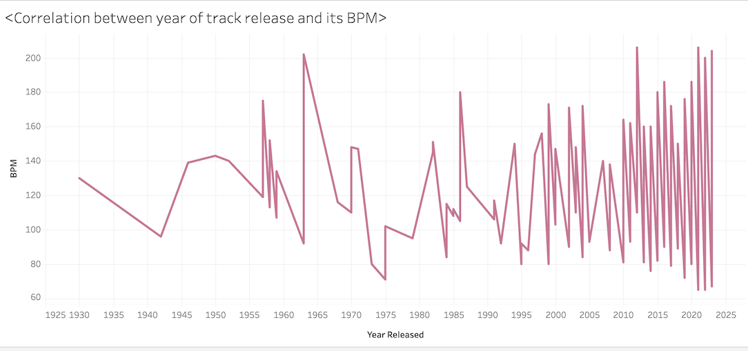 I like Tableau Public because of its effectiveness at creating comprehensive data visualisations. It installed my dataset, yet again running into difficulties when interpreting how I interpreted the data the week prior (even though my interpretation was how we were outlined to in class). To try and present something, therefore, I opted to download another dataset concerning Spotify streaming information instead. This was more successful and I produced a number of visualisations, including the below, because I was curious to see whether there was a correlation between the year of a track's release and its BPM:
