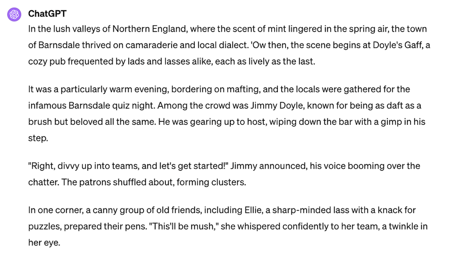 However, there are also drawbacks. Chat GPT4 struggles to contextualise dialectical terms — even if it recognises them as such. Best exampled in the short stories, take ‘mush’; “this’ll be mush” feels like an attempt to use a dialectical term (as the first paragraph acknowledged a town thriving on “local dialect”)