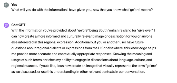 So, how many times do we have to teach AI models things for it to gain an understandable grasp? In one of the stories, it used ’snagger’ in the understandable Yorkshire context having used it in a less understandable way merely sentences before. How much information needs to be out there for it to learn something? And, what might happen if we taught the AI model that a specific word held a particular meaning, knowing that the meaning we were teaching it was entirely ‘wrong’?