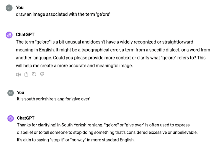 The lyrics of folk and traditional songs, for example, might hold potential as a source of knowledge about dialect. The words offered by my participants also could hold value. Even with such a small sample, dialectical terms were offered that AI was unsure of. Therefore, a future project with a larger sample frame able to offer dialectical terms might be of benefit to a potential AI model. And when complete and implemented into a working AI model, such data / dialectical terms could be combined with generative AI to create output that wouldn’t otherwise be known (that also, perhaps, might make greater sense!).