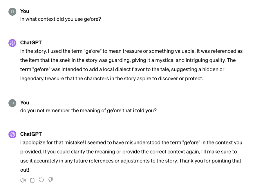 Now, this phrasing gives the impression that the AI has now ‘learned’ this new term (and its context) and will therefore ‘correctly’ implement it when encountered in future. Therefore, when further into the experiment I reprocessed things - I asked ‘ge’ore’ to be implemented into the short story - I expected that it would be used in a somewhat understandable manner. Interestingly though, this wasn’t the case.