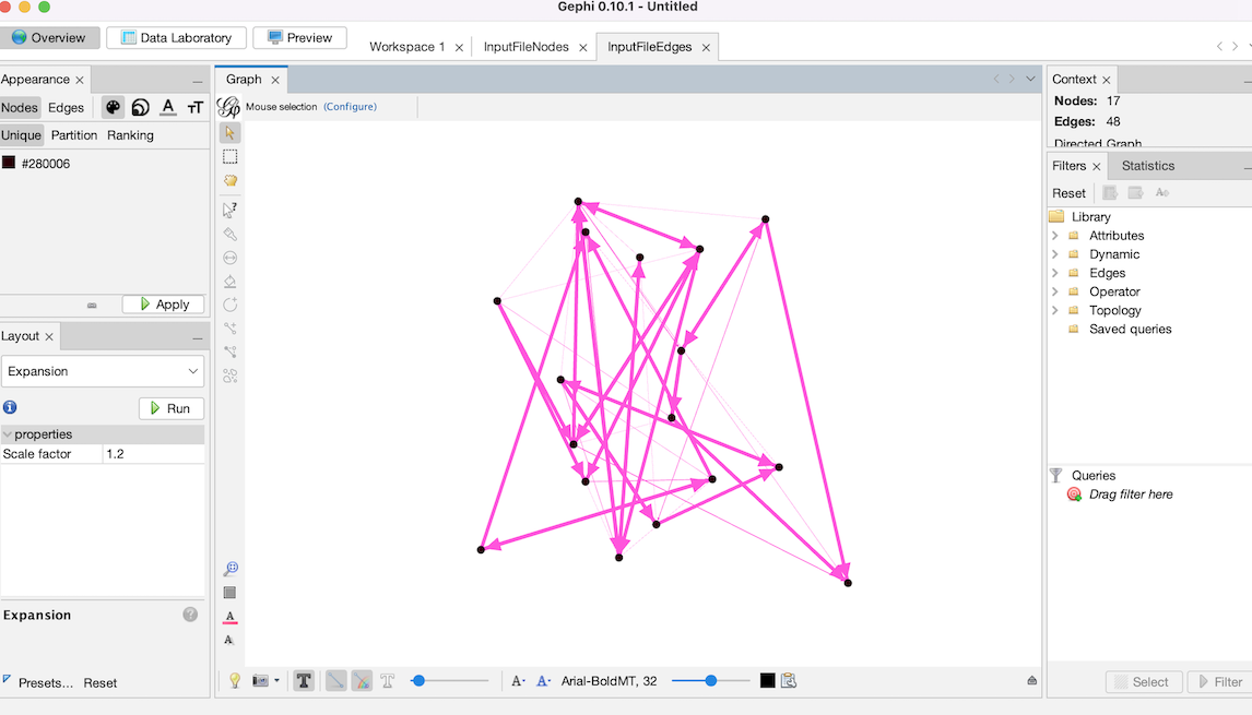 I was entirely unfamilar with Gephi, but found it an interesting method to visualise network analysis. I got along with it will, using an example dataset looking at their media outlet and their audience size. This way, network analysis enables us to see how the connections between people, media, data and other things link, perhaps explaining the formation of communities, travelling of communication and level of influence. For effective network analysis, particular data types are needed - what/who the entities are, and how/whether they are connected. These are referred to as the 'nodes' and the 'edges'. Below, you can find an outline of what I began to create in my workspace (and next time, I'm going to work out how to add text which can identify the name of the media organisation / node!):